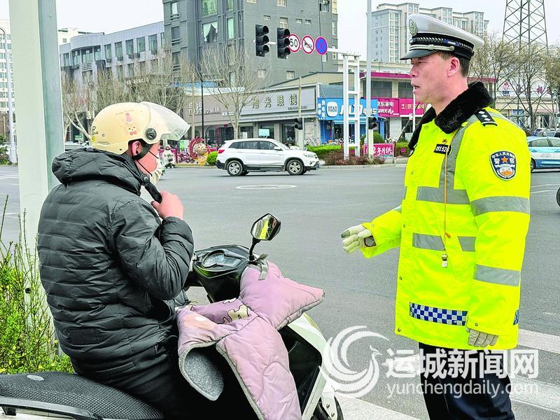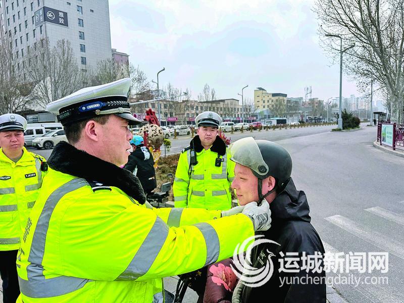 “头盔不是给交警看的,是关键时候保命的。”在早高峰执勤间隙,马鹏一边拦下一名未佩戴头盔的电动自行车驾驶人,一边耐心地帮其系紧绑带,“先戴上再走,别图这一时方便。”看到对方有些犹豫,他又耐心解释,“很多事故就是一瞬间,有没有头盔,结果完全不一样。”驾驶人点了点头,把头盔扣好才重新上路。