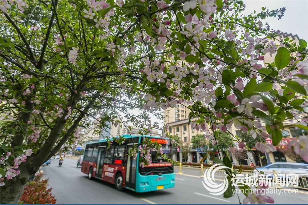 3月23日,中心城区一辆公交车从缀满鲜花的海棠树旁驶过。