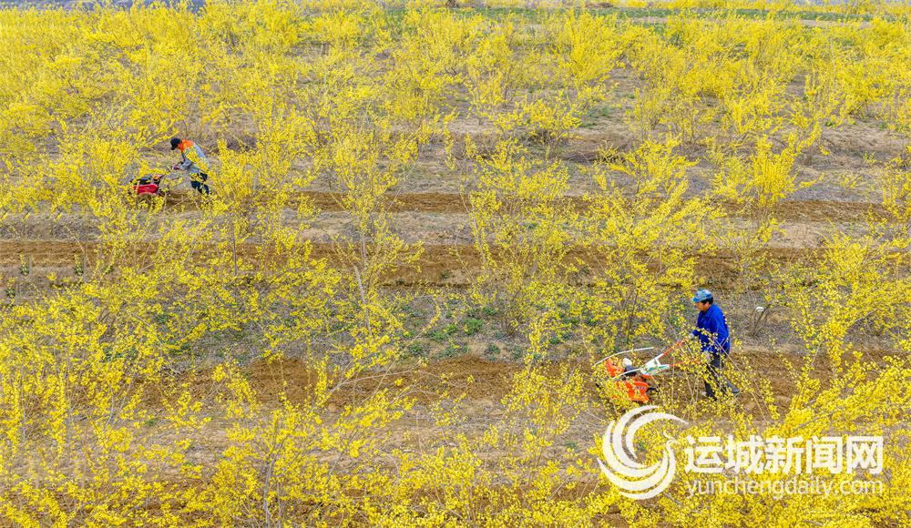 眼下正值连翘盛花期,绛县南樊镇沸泉村村民驾驶农机在田间松土保墒、清除杂草,忙碌的身影与金黄的花海勾勒出一幅花繁枝茂、农事繁忙的春耕盛景图(3月23日摄)。