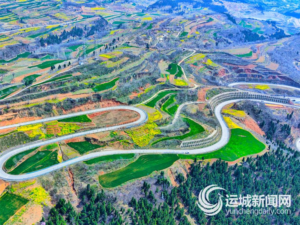 3月25日,航拍镜头下的黄河一号旅游公路平陆县曹川段沿线春日风光,景美如画。近年来,平陆县加快沿黄生态廊道建设,加大生态示范创建力度,让古虞大地天更蓝、山更绿、水更清。特约摄影 郝 健 摄