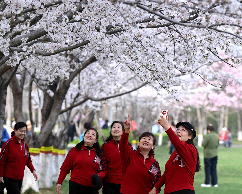 3月26日,游人在河北省石家庄市石津灌渠文化公园赏花拍照。新华社发(陈其保 摄)
