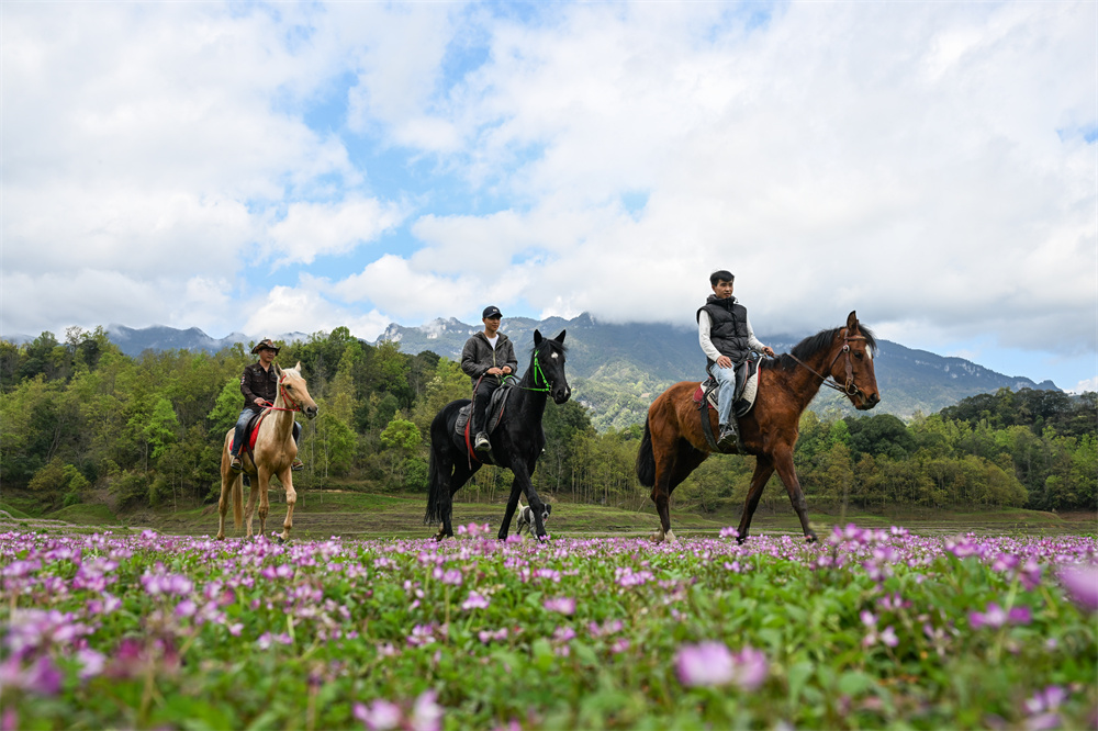 3月26日,在重庆市武隆区石桥苗族土家族乡八角村,游客在紫云英花海中骑马。 新华社记者 陈 诚 摄