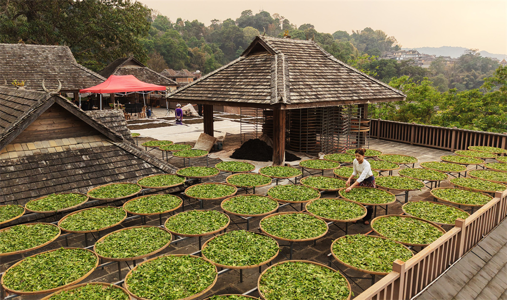 春分过后,景迈山迎来春茶采收季,村民利用晴好天气,将采摘后的鲜叶铺展于民居屋顶上晾晒,描绘出一幅山村“晒春”图。 新华社发(梁志强 摄)