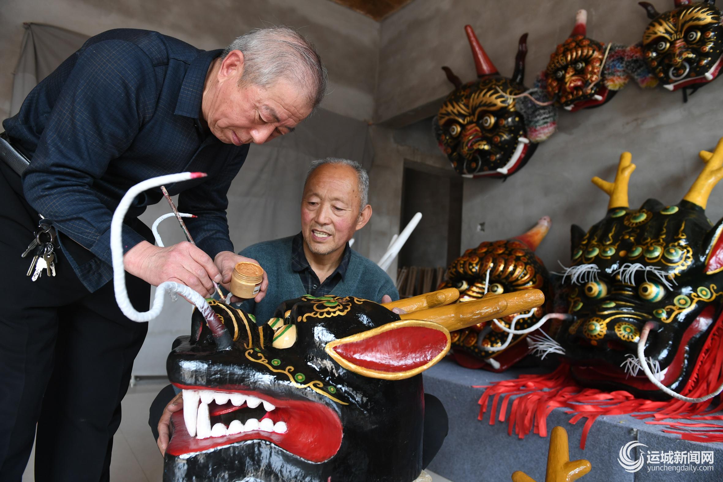 3月27日,稷山县阳城高跷走兽保护中心的非遗代表性传承人精细勾勒高跷走兽兽头。