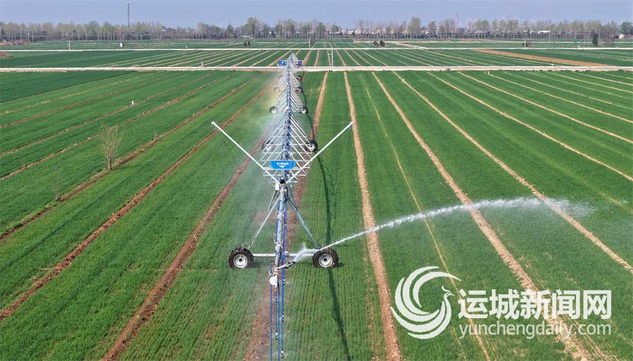 3月31日,在稷山县化峪镇阳平智慧农业示范区,工人利用智能化平行行走式水肥药一体机给麦田喷灌和施肥。