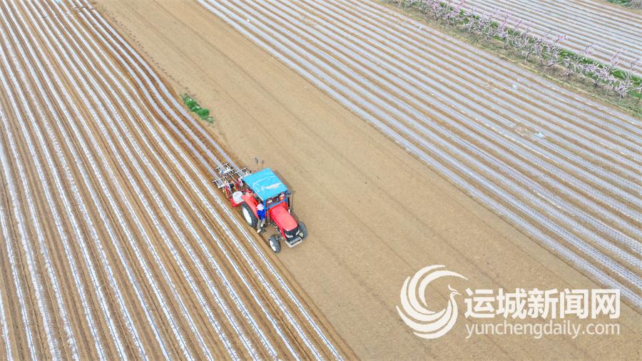 4月2日,稷山县稷峰镇村民在田间给中药材地黄铺设滴灌带和地膜。