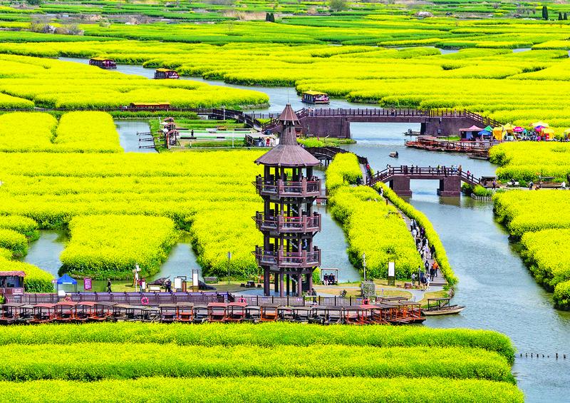 4月8日,游客在江苏省兴化市千垛景区赏花游玩(无人机照片)。