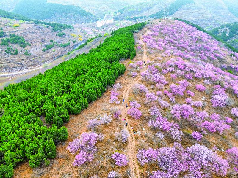 时下,山东省淄博市博山区石马镇上焦村桃花盛开,红粉色桃花撞色山脊另一侧的绿色松树,形成别样春日景象。