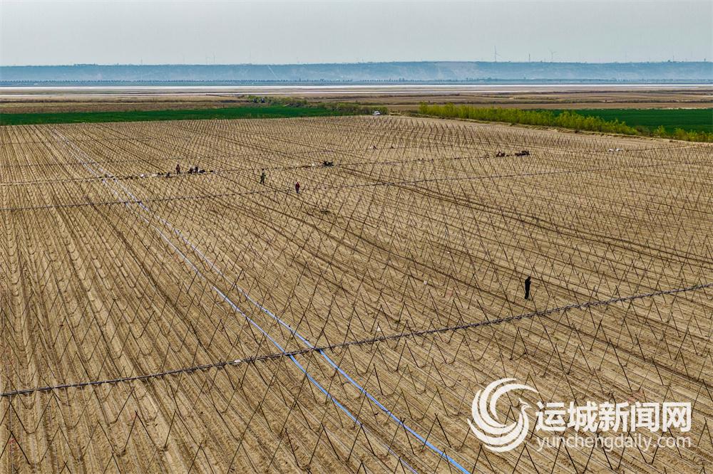 4月7日,永济市黄河滩涂千亩铁棍山药种植基地,种植户在加固竹架、铺设滴灌管带。