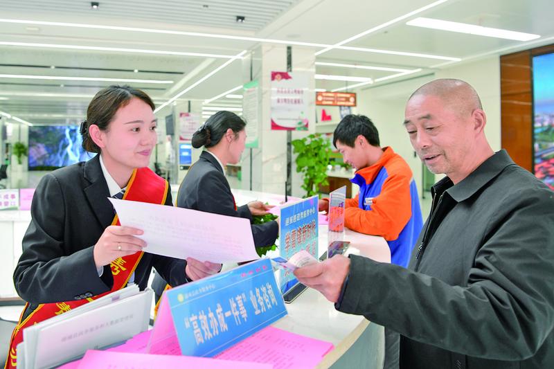4月8日,在湖北省咸宁市通城县政务服务中心,工作人员为市民提供引导服务。近年来,湖北省咸宁市通城县以“高效办成一件事”为目标,专设“一件事”受理窗口,通过精简办事流程和材料,推行关联事项集成办、异地事项跨域办、政策服务免申办等举措,提高办事效率,方便群众企业。