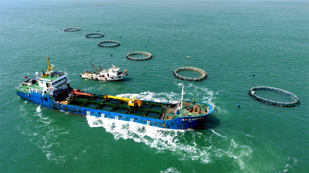 近日,作业船只准备停靠山东青岛西海岸新区鲁海丰海洋牧场,将2026年首批10万尾鱼苗投入深水网箱进行养殖。据悉,青岛鲁海丰海洋牧场地处国家一类水质海域,水温适宜、盐度均衡,比较适宜海鱼生长。