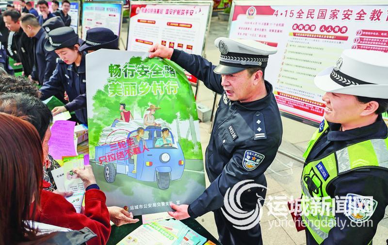 4月15日,新绛县公安交警在新绛县全民国家安全教育日活动现场,为群众宣讲全民国家安全教育相关法律法规。多种宣传形式吸引大家积极参与,在学法守法中增强全民守护国家安全的意识。