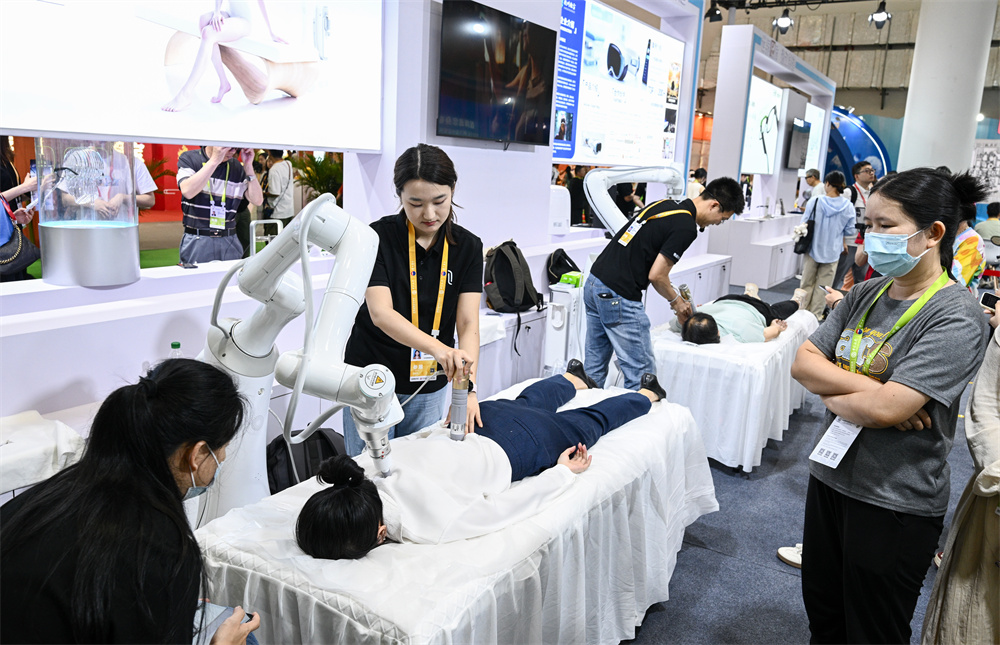 4月14日,观众在第六届消博会现场体验智能按摩机器人。
